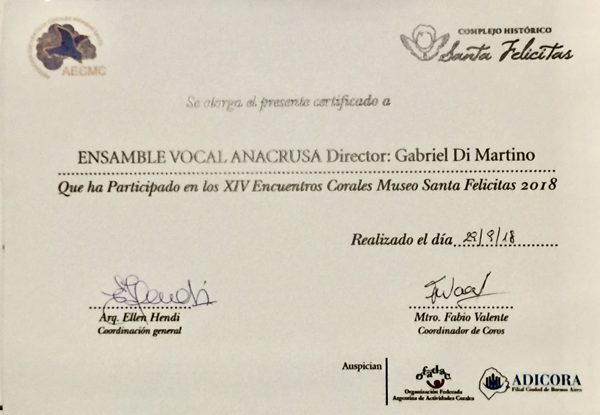 Presentación en los XIV Encuentros Corales en el Museo Santa Felicitas, Ciudad de Buenos Aires.