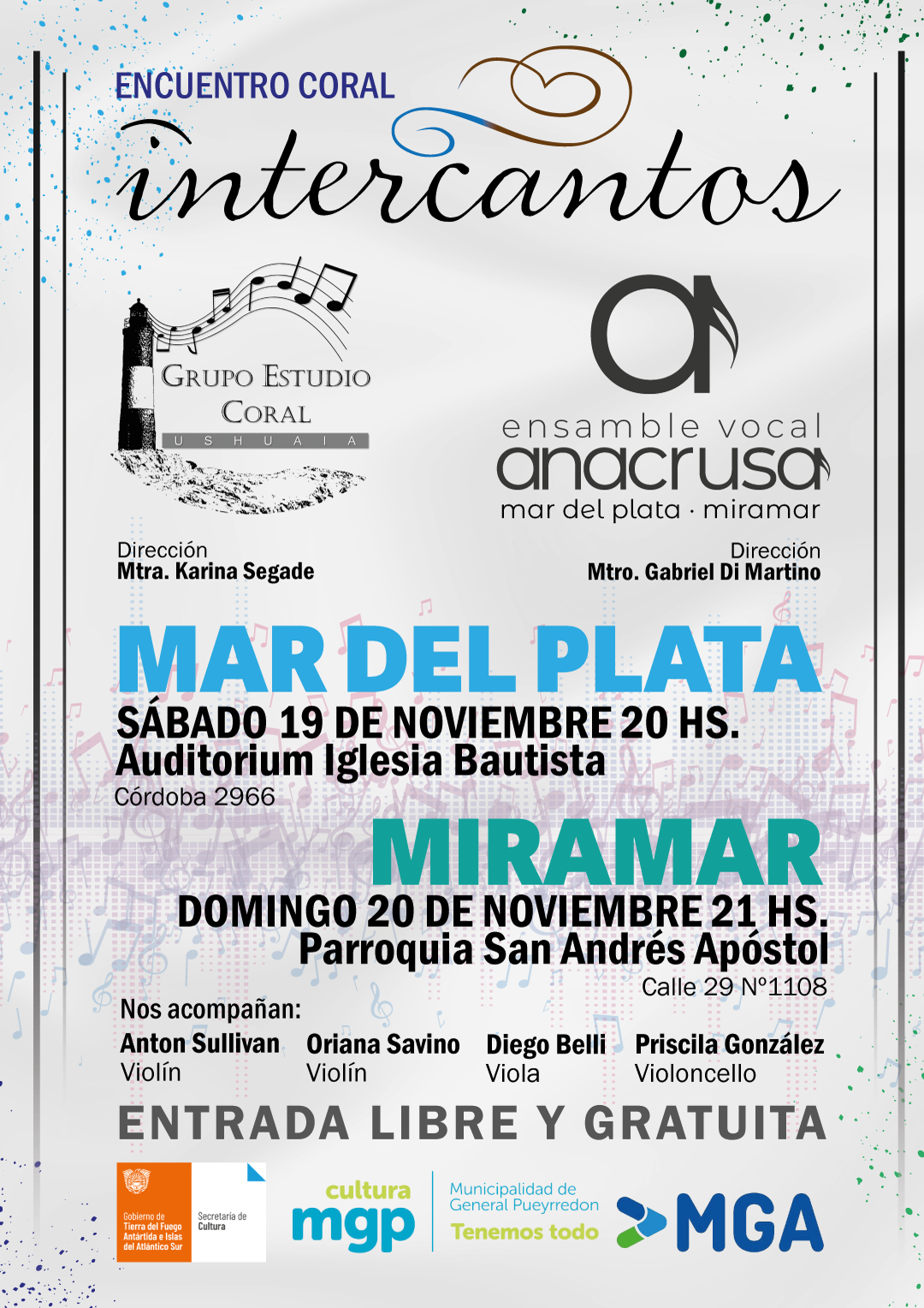 Recibimos en Miramar y Mar del Plata al Grupo Estudio Coral Ushuaia y se replican los conciertos realizados en Ushuaia incorporando además un cuarteto de cuerdas para la masa coral. El taller para coreutas en esta oportunidad fue realizado por la Mtra. Eva Andrea Luna Navarre en Villa Mitre (Mar del Plata).