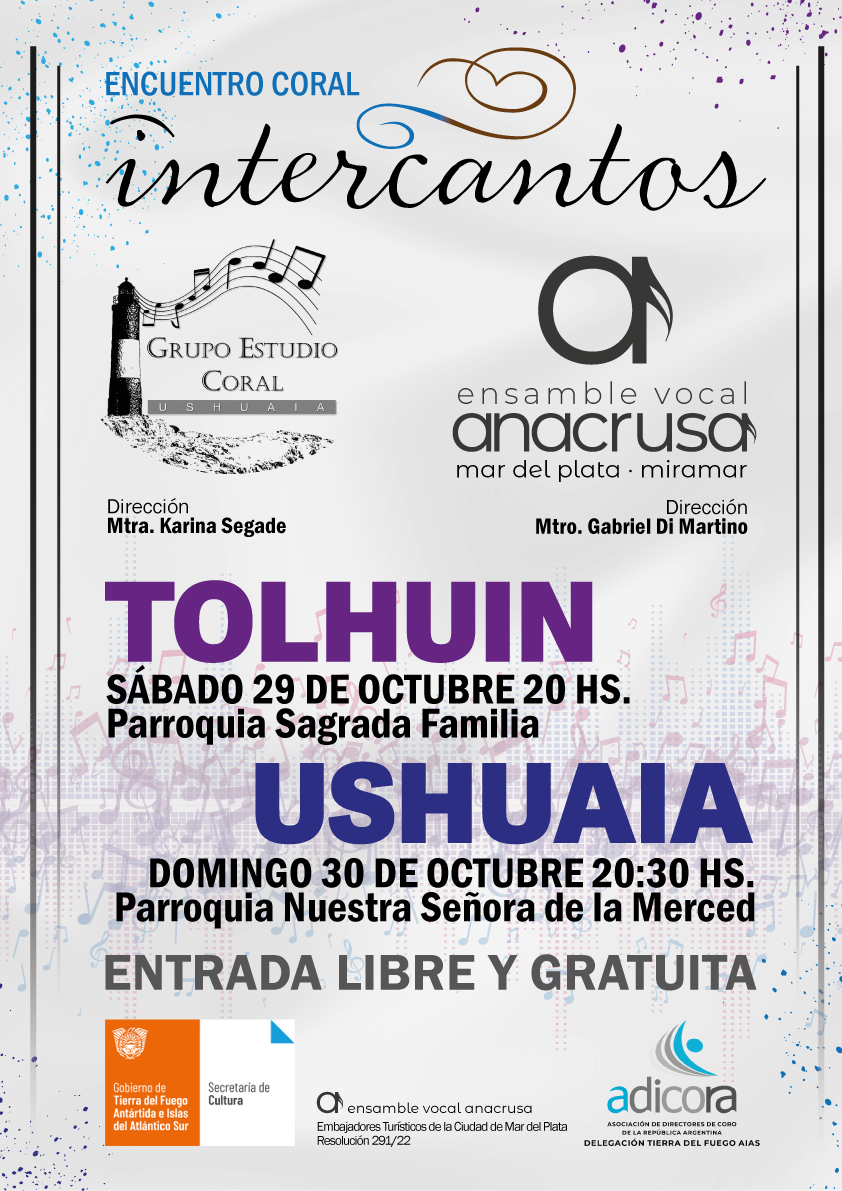 Viaje a Ushuaia para el Encuentro denominado “Intercantos”, preparado en conjunto con la Mtra. Karina Segade, directora del Grupo Estudio Coral Ushuaia, quienes cumplían sus primeros 20 años en actividad. El Ensamble Vocal Anacrusa, habiendo sido nombrados “Embajadores Turísticos” se ha presentado en las ciudades de Ushuaia y Tolhuin finalizando ambos conciertos con cinco obras cantadas en masa coral, incorporando una versión coral exclusiva para dicho encuentro realizada por el Mtro. Marcelo Valva, quien además realiza un taller para coreutas sobre lectura e interpretación de obras.